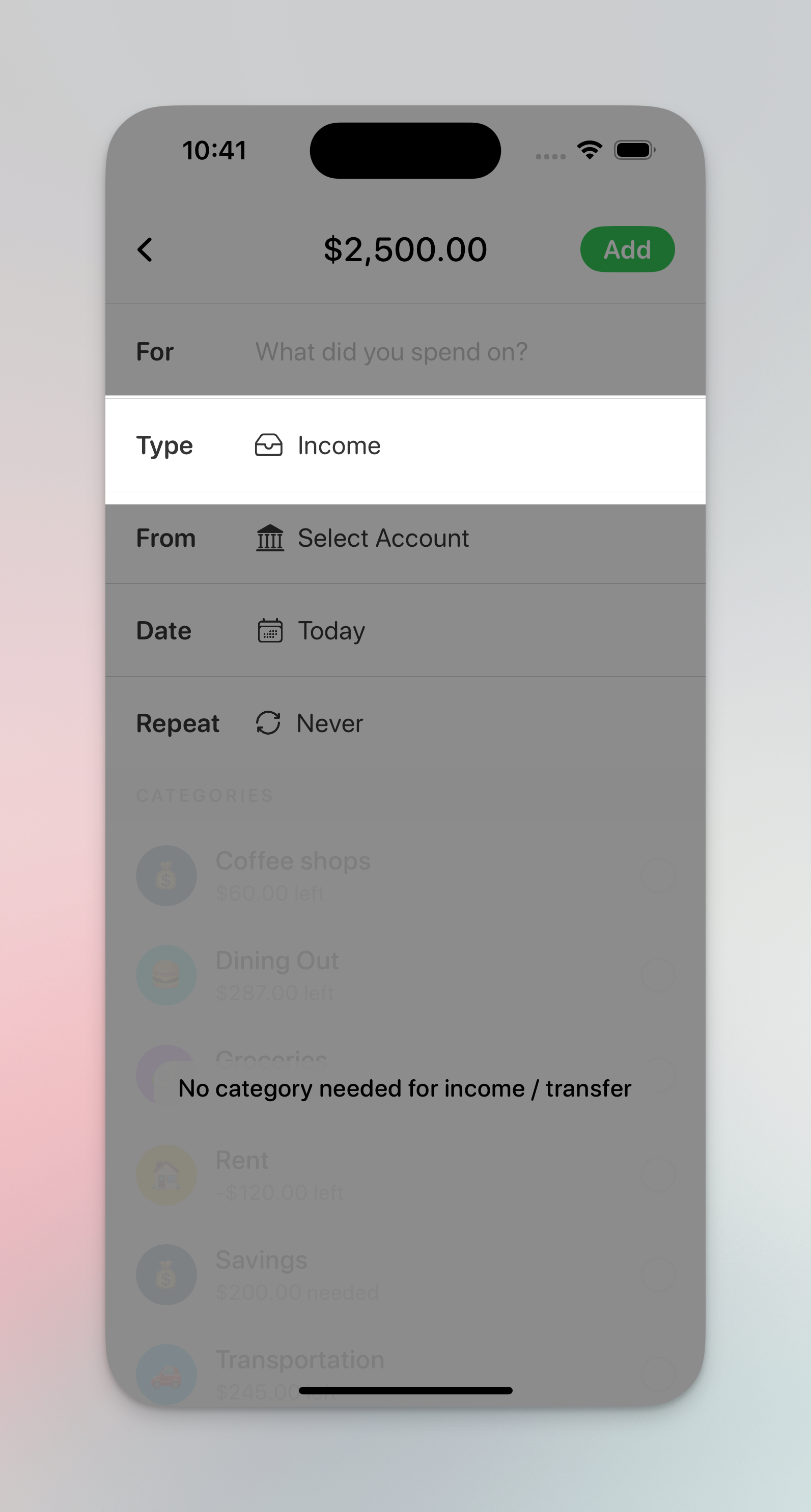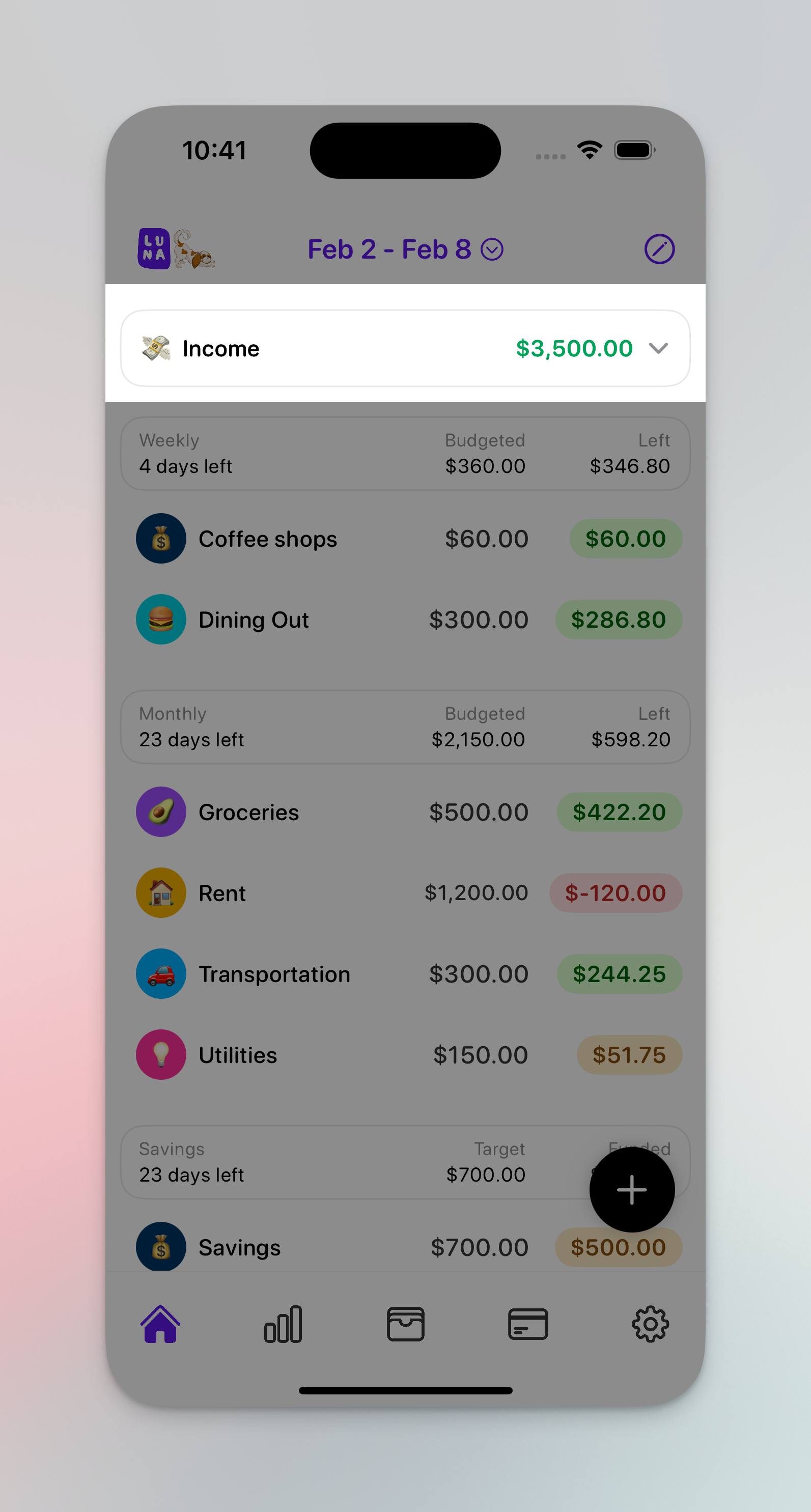 TIP: Use [recurring transactions](https://guide.lunabudgeting.com/features/recurring-expenses) if you have a fixed amount of income per month if you want to save time from inputting this